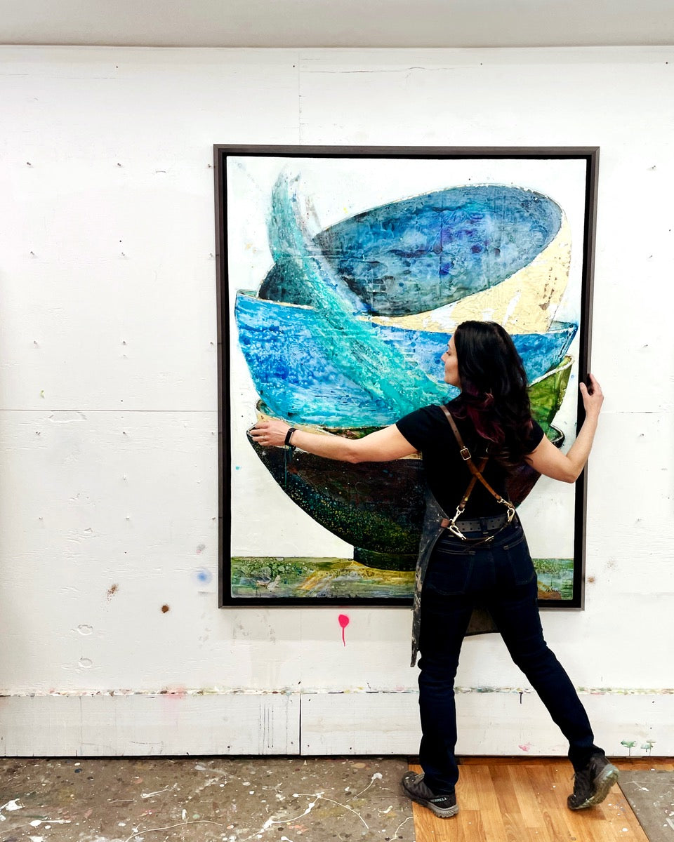I work intuitively with oils, acrylics, graphite, & gold leaf. My goal is to fuse the acts of painting and drawing into layered surfaces suggesting a sense of atmosphere. With richly colored layers of mixed media that hover between abstraction and representation, my work creates an immersive visual experience that invites us into reflection.