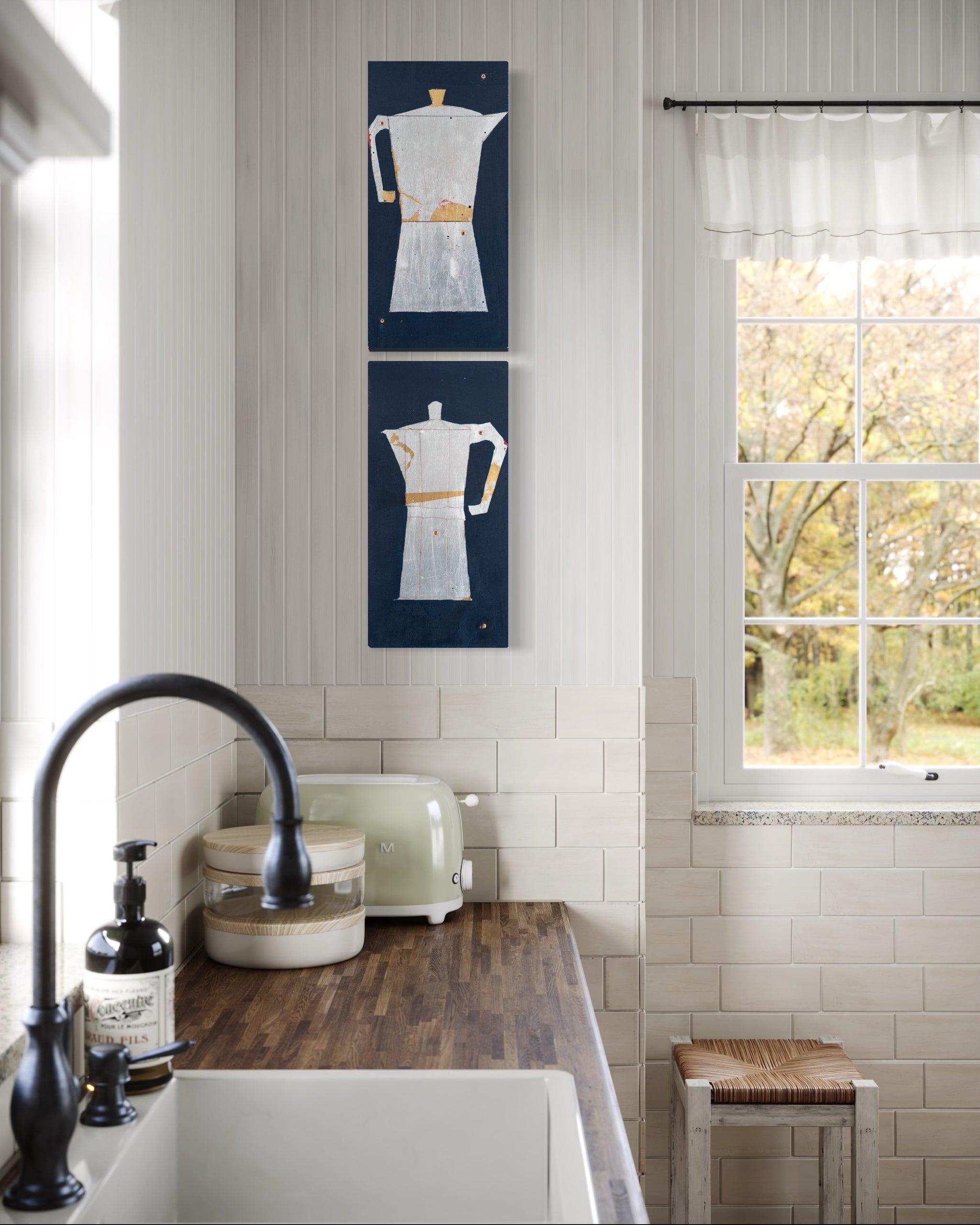 These cafeteras have been in my sketchbook for years and it’s been bliss to carve them out of silver & gold leaf on birch with copper rivets that are the pearls of the paintings.